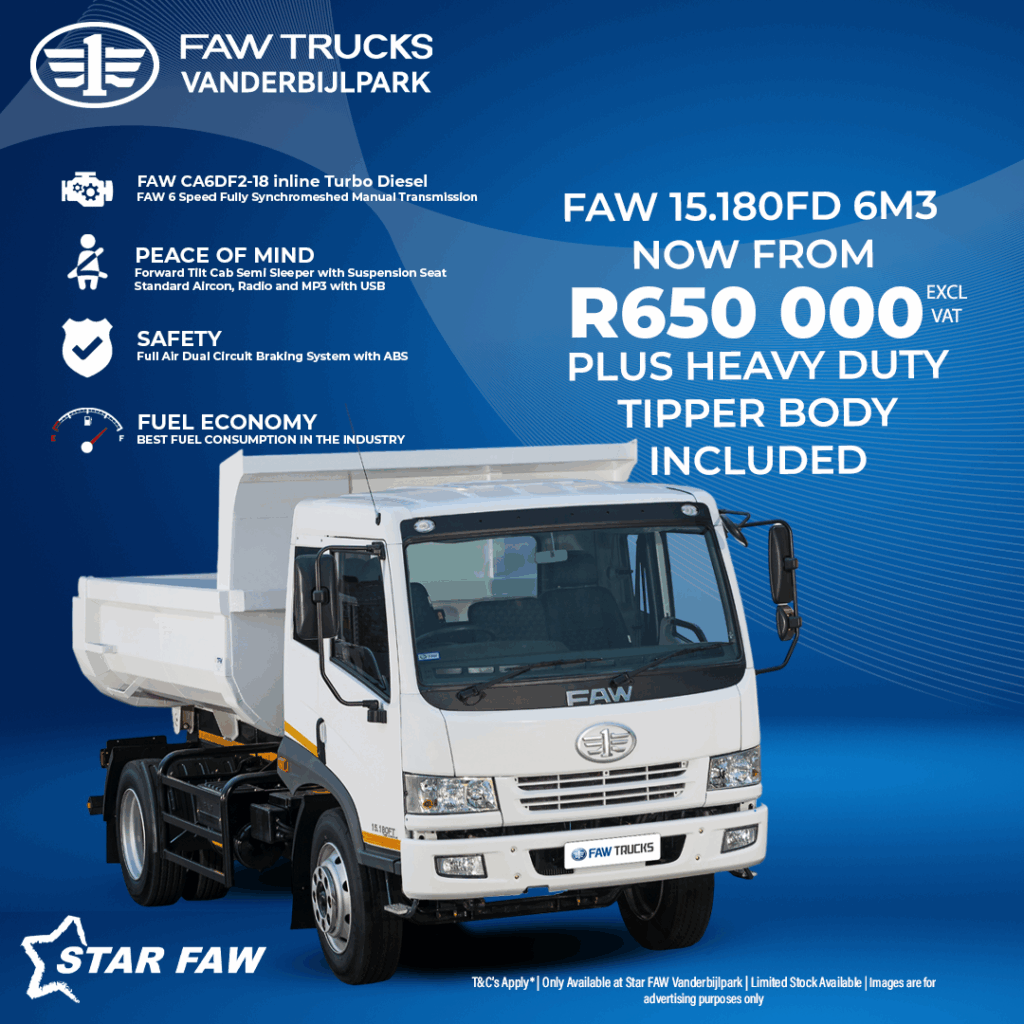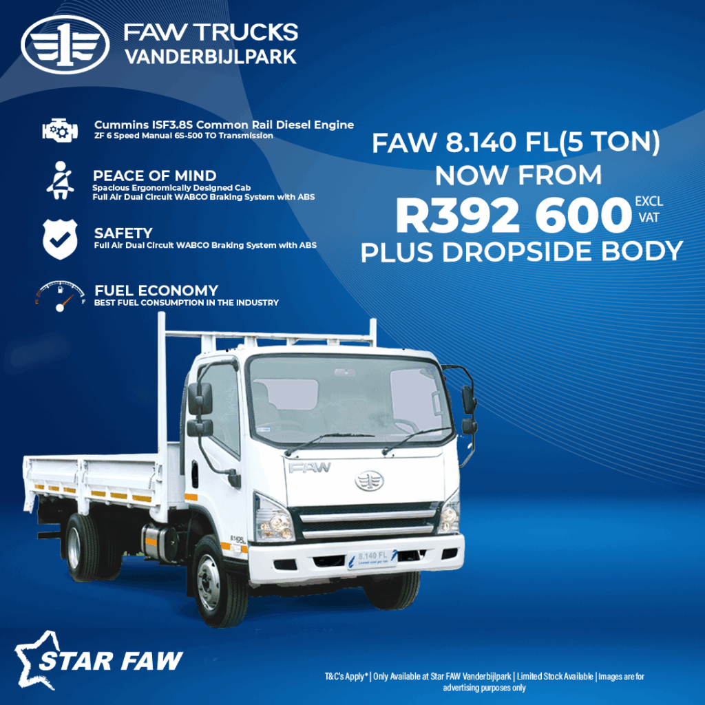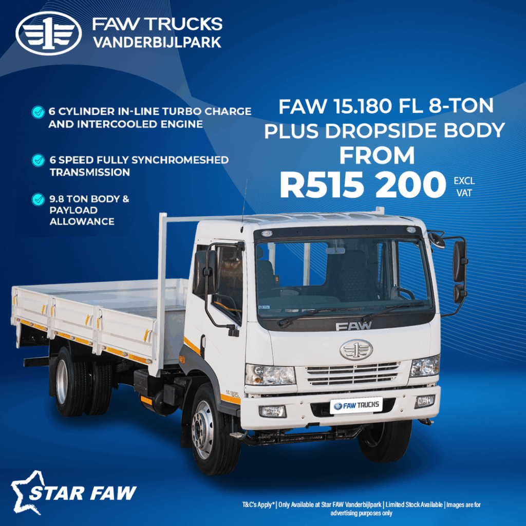 FAW Vehicle Manufacturers South Africa (Pty) Ltd (FAW SA), is a division of the Fortune 500 FAW China Group Corporation. Provider of rugged, reliable and affordable medium, heavy and extra heavy Commercial Vehicles to the Southern African market.